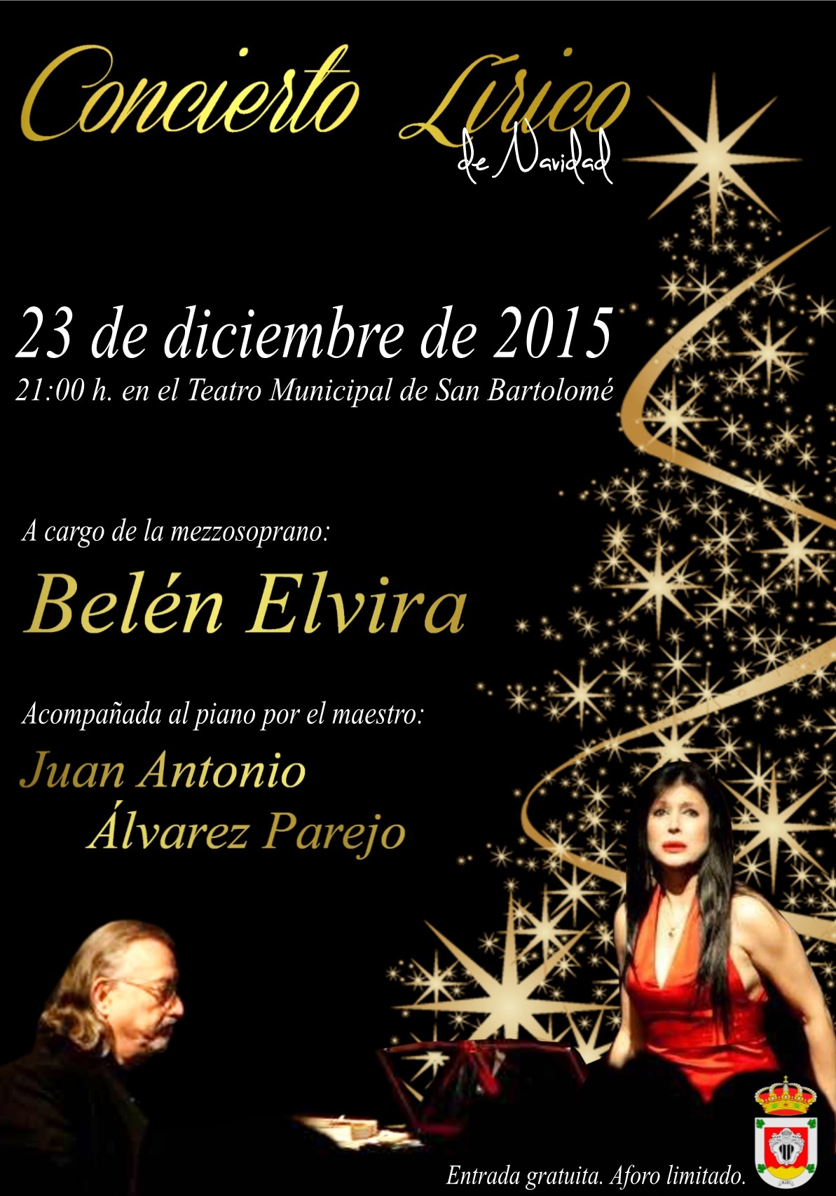 Belén Elvira ofrecerá un concierto lírico de navidad acompañada al piano por el maestro Juan Antonio Álvarez Parejo, “con un programa que incluye obras de diferentes estilos dentro del repertorio lírico. Abarcará desde la canción napolitana, hasta el bolero y la canción mejicana, al tiempo que incluye el vals lento, pasando por las canciones del maestro Padilla. Este concierto propone a los asistentes, según palabras de la mezzosoprano “un paseo desde la mitología eslava hasta el sentimiento más gitano de la mano de las óperas de Dvorak y Bizet, pero sin olvidar el sello español, con identidad propia a través de la zarzuela”.