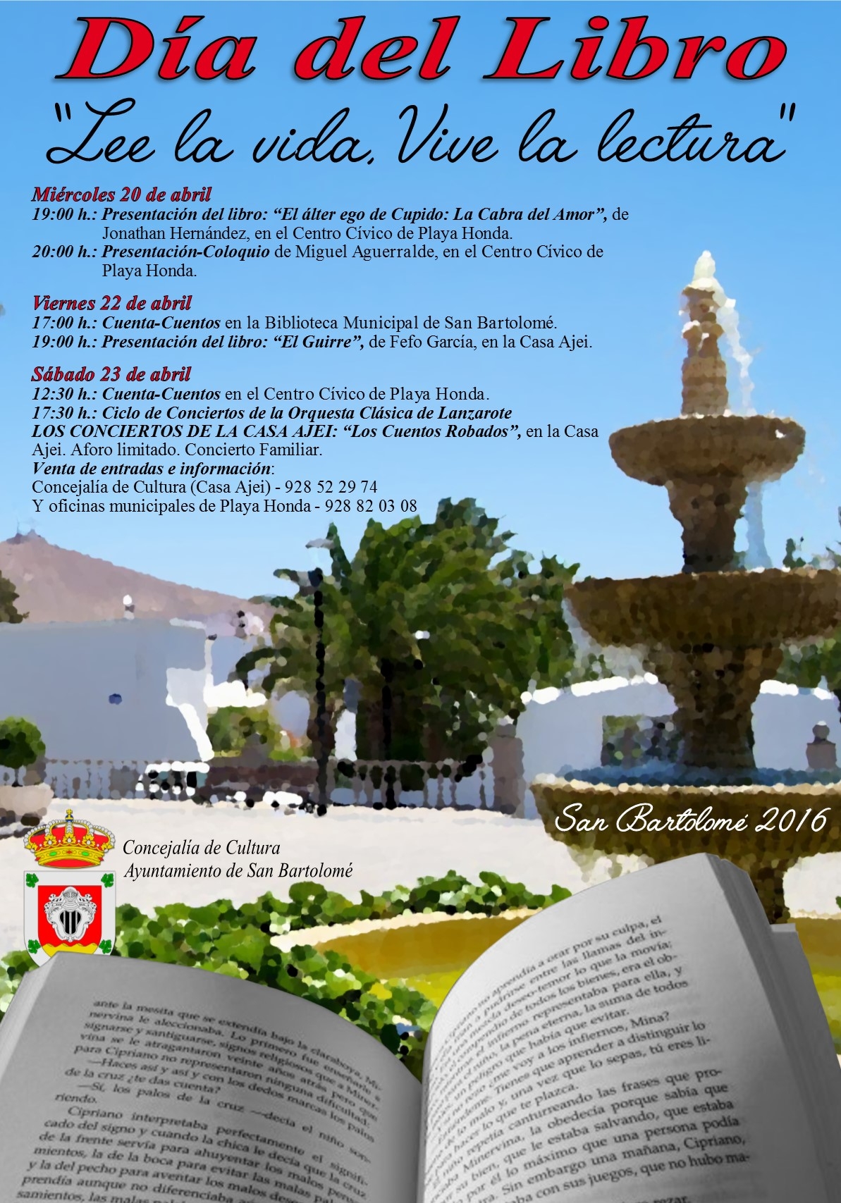 Un año más, la Concejalía de Educación y Cultura del Ayuntamiento de San Bartolomé se ha volcado en la organización de actividades para celebrar el Día del Libro, “una jornada que desde el Consistorio queremos que se celebre 365 veces al año, tal y como invitamos con nuestro lema: “Lee la vida. Vive la lectura”, señala la edil responsable, Alma Mª González Mauri.