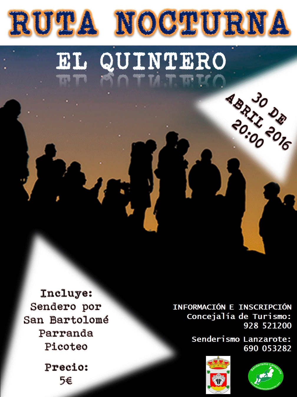 Dentro de las Noches de… tendrá lugar la Ruta Nocturna “El Quintero”, el sábado 30 de abril a las 20:00 horas, con una ruta circular por la zona del Quintero, incluyendo sendero por San Bartolomé, Parranda y picoteo, a 5€ por persona. Organizado por la Concejalía de Turismo del Ayuntamiento de San Bartolomé y Senderismo Lanzarote.