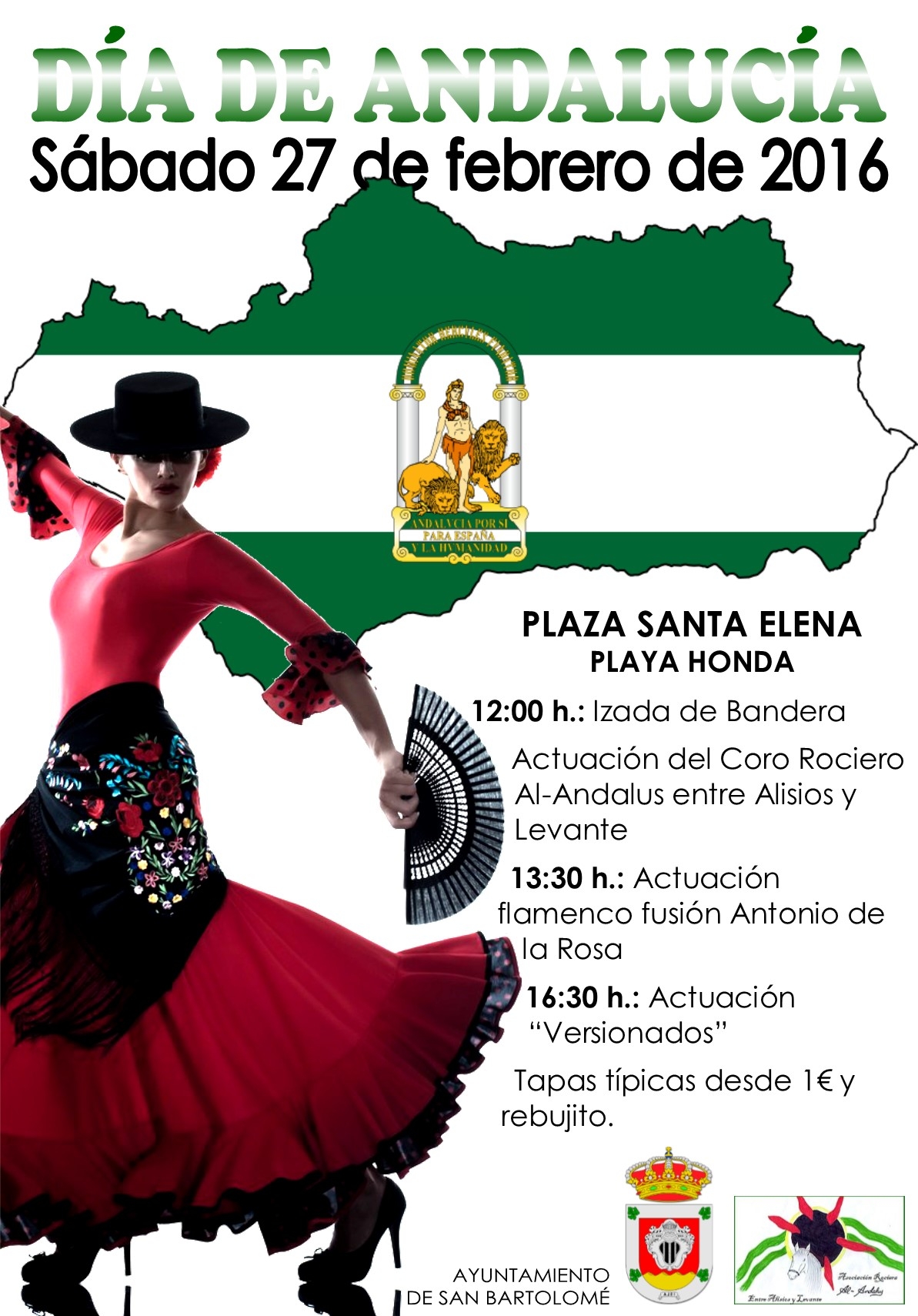 Playa Honda, el sábado, 27 de febrero, contará con motivo de la celebración del Día de Andalucía, con el izado de bandera para conmemorar simbólicamente dicha festividad, a las 12.00 horas en la Plaza Santa Elena. Mientras se esté alzando la bandera sonará el himno de Andalucía, y posteriormente los asistentes disfrutarán con la tradicional salve rociera y algunas sevillanas de la mano del Coro Rociero Al-Andalus entre Alisios y Levante.