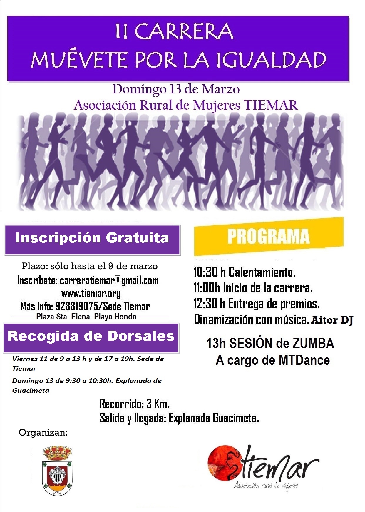 El Domingo, 13 de marzo, la Asociación Rural de Mujer Tiemar conjuntamente con el Ayuntamiento de San Bartolomé a través de las concejalías de igualdad y deportes organizan la “II Carrera Muévete por la igualdad”, que tendrá un recorrido de 3 km. con salida a las 11.00 horas, desde la Explanada de Guacimeta, también punto de llegada. Inscripción previa, gratuita y con un total de 200 plazas disponibles.