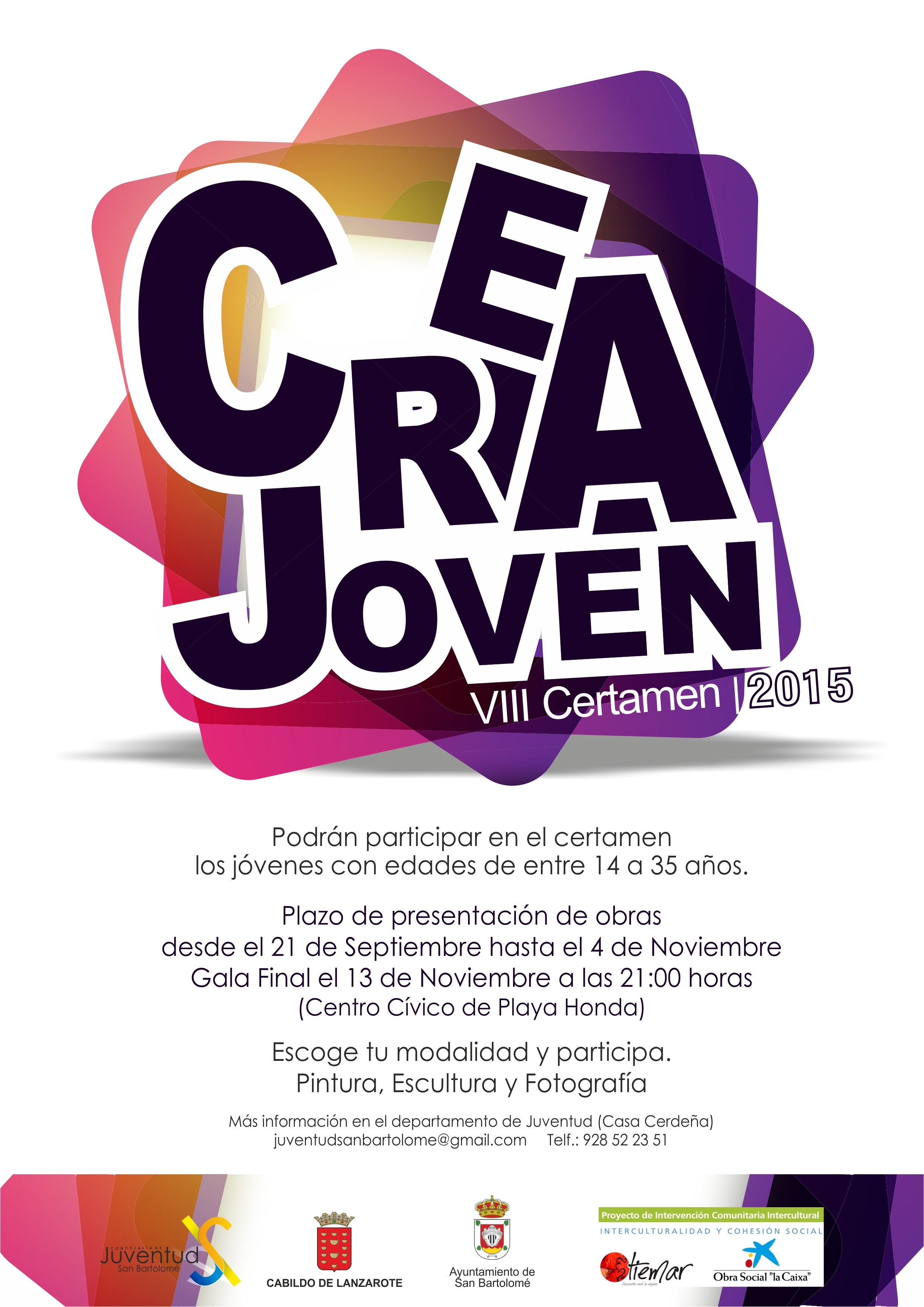 La VIII Edición del Certamen Crea Joven al que se podían presentar 2 obras por participante de temática libre en las modalidades artísticas de pintura, escultura y fotografía, se fallará el viernes 13 de noviembre, contará como máximo con cuatro premiados, con 1.500 euros a repartir entre los trabajos que resulten ganadores según la valoración de calidad de la obra, dificultad y creatividad que estime el jurado formado por Ramón Machín (ceramista y diseñador gráfico) presidente, Marcos Felipe Anaya (Profesor de Dibujo Artístico de la Escuela de Arte Pancho Lasso), Moisés Gutiérrez (ganador del VII Certamen Crea Joven de San Bartolomé), y secretario, Felipe de León (técnico del área de juventud del Ayuntamiento de San Bartolomé, sin voz ni voto).