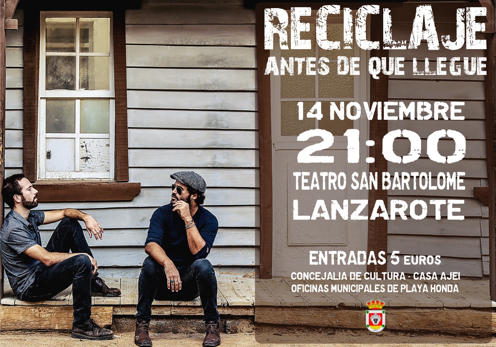 La banda de rock and roll RECICLAJE formada por el dúo canario, Quino Martínez (Gran Canaria) y Ángel Quintana (Lanzarote), ambos músicos procedentes de otras bandas y con algunos años de experiencia en el oficio musical, se presentará en escena junto a cerrando los dos miembros más recientes de la banda, Daniel Cárdenes a la batería y José Carlos Cejudo al bajo, y ofrecerán un concierto en el Teatro de San Bartolomé el sábado, 14 de noviembre, a partir de las 21.00 horas para presentar en la isla su trabajo “Antes de que llegue”. Las entradas salen a venta a 5€.