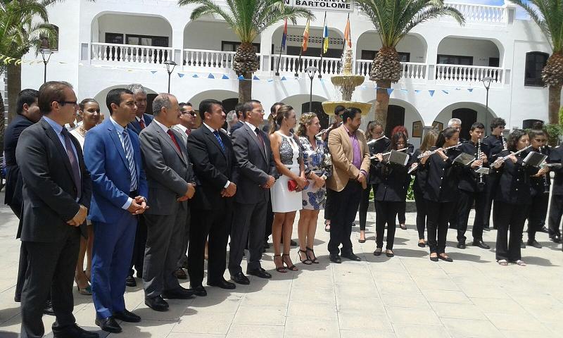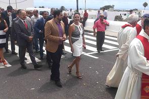 La Alcaldesa, María Dolores Corujo y Corporación Municipal junto a autoridades civiles, militares y vecinos/as acompañaron a San Bartolomé en procesión, por las calles del pueblo este mediodía.