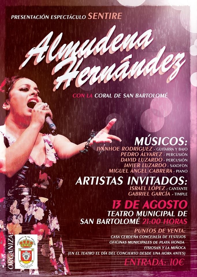 Tras la actuación de la Coral Municipal dará comienzo el Espectáculo Sentire, un recorrido por distintos palos del panorama musical en el que Almudena Hernández hará vibrar con canciones como Bésame mucho, El Escaramujo, Chacarera para mi vuelta de Soledad Pastorutti, entre otros.