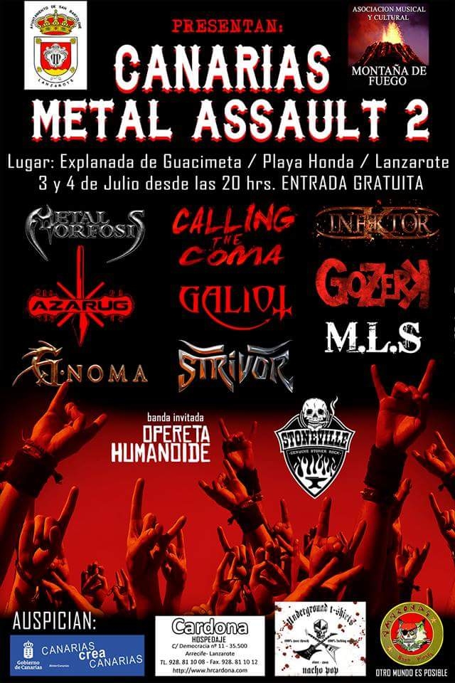 La Asociación Musical y Cultural Montañas del Fuego en colaboración con el Ayuntamiento de San Bartolomé presenta el Canarias Metal Assault 2, que traerá hasta la Explanada de Guacimeta en Playa Honda los días 3 y 4 de julio desde las 20.00 horas y con entrada gratuita a los grupos Opereta Humanoide, Calling the Coma, Infektor, Metalmorfosis, G-Noma, Azarug, M.L.S., Stoneville, Gozerk, Strivor y Galiot.