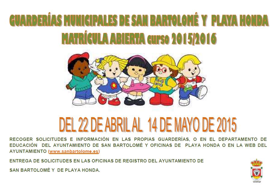 A partir del miércoles día 22 de abril y hasta el 14 de mayo, estará abierto el plazo de presentación de solicitudes de matrícula en las Guarderías Municipales de San Bartolomé y Playa Honda.