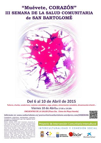 Del día 6 al 10 de Abril se celebrará en el municipio de San Bartolomé la III Semana de la Salud Comunitaria “Muévete, Corazón”, una semana llena de actividades y conocimiento a potenciar hábitos de vida más saludables y en concreto a la prevención de La Enfermedad Cardiovascular. Es una iniciativa que parte del estudio participativo “Monografía Comunitaria: Haciendo Pueblo” y el diagnóstico comunitario, donde se pone de manifiesto la necesidad de Educar para Salud. Más de una treintena de recursos técnicos y comunitarios se organizan en una comisión de trabajo para poner en marcha esta acción comunitaria que pretende sentar las bases en el camino hacia un municipio "socialmente saludable" y del mismo modo sentar precedente y trabajar preventivamente en clave de salud, incorporando una gestión desde la diversidad cultural, la equidad, por la convivencia y la cohesión social.