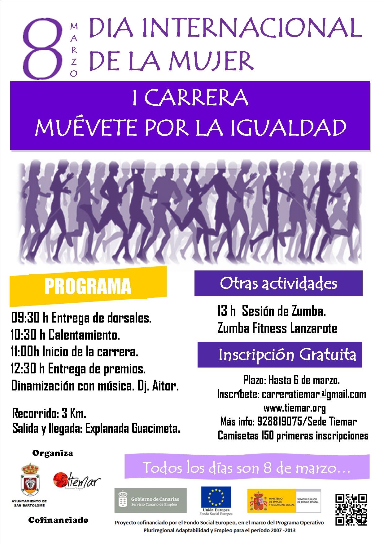 Con motivo de la celebración del Día Internacional de la Mujer, el próximo 8 de marzo, el Ayuntamiento de San Bartolomé y la Asociación Rural de Mujeres Tiemar organizan la primera edición de la Carrera “Muévete por la Igualdad”. La actividad se enmarca dentro del programa de actos que la Asociación organiza con motivo de esta fecha.