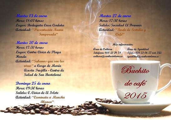 El Buchito de café todos los martes contará con su cita habitual, rotándose por los diferentes pueblos del municipio. Las asistentes a este espacio de ocio, disfrutarán a lo largo de esta temporada con formación, información, actividades lúdicas y charlas, todo incluido dentro de una amplia y diversa programación. Sirve como nexo de los vecinos de las distintas localidades del municipio, a través de la amplia y variada programación, animando el Ayuntamiento de San Bartolomé a las usuarias habituales y toda la vecindad a participar en la atractiva programación mensual.