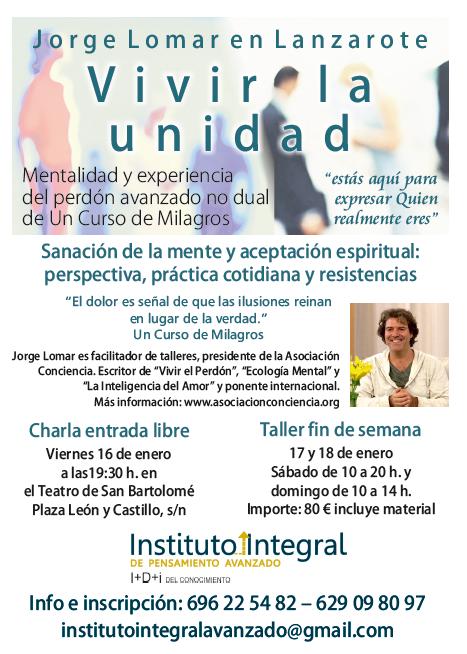 Conferenciante internacional y presidente de la Asociación Conciencia para el Crecimiento Humano, Jorge Lomar dirige a través de esta Asociación la Escuela del Perdón y ha desarrollado una metodología de prácticas interiores fundamentadas en las enseñanzas de la filosofía advaita y de un Curso de Milagros. Asimismo, Jorge Lomar impartirá el sábado 17 y domingo 18 de enero un taller titulado también “Vivir la Unidad”.