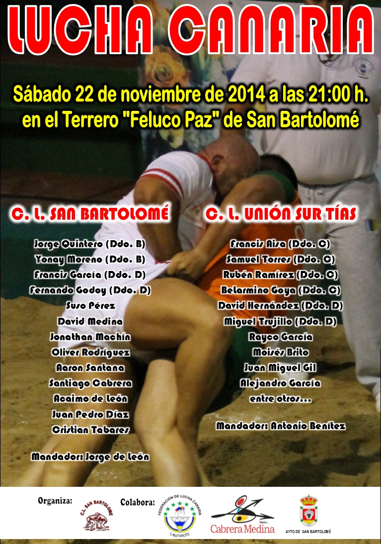 Organiza: C.L. San Bartolomé en colaboración con Federación de Lucha Canaria Lanzarote, Cabrera Medina y Ayuntamiento de San Bartolomé.