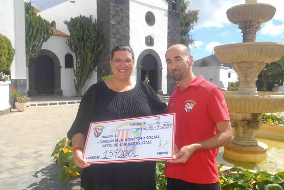 El pasado martes, el San Bartolomé C.F. entregó 1.590€ que fueron recogidos por la Concejal de Bienestar Social, Carmen González, siendo ésta la primera de dos entregas de talones, que revertirán en usuarios de los servicios que oferta la concejalía.