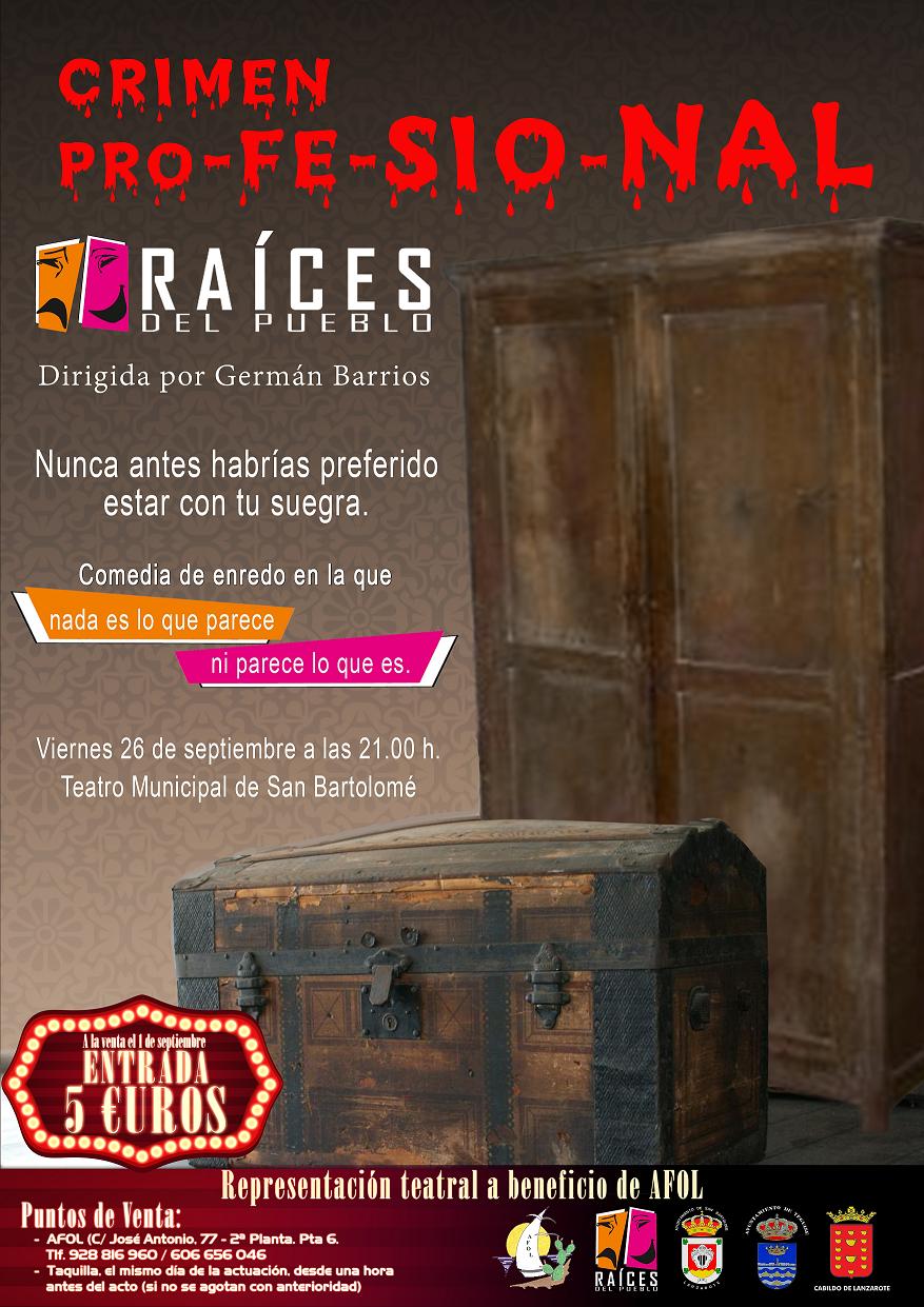 El viernes 26 de septiembre, a las 21:00 horas, el grupo teatral Raíces del pueblo, pondrá en escena CRIMEN PRO-FE-SIO-NAL, dirigida por  Germán Barrios,  en el Teatro Municipal a beneficio de AFOL.