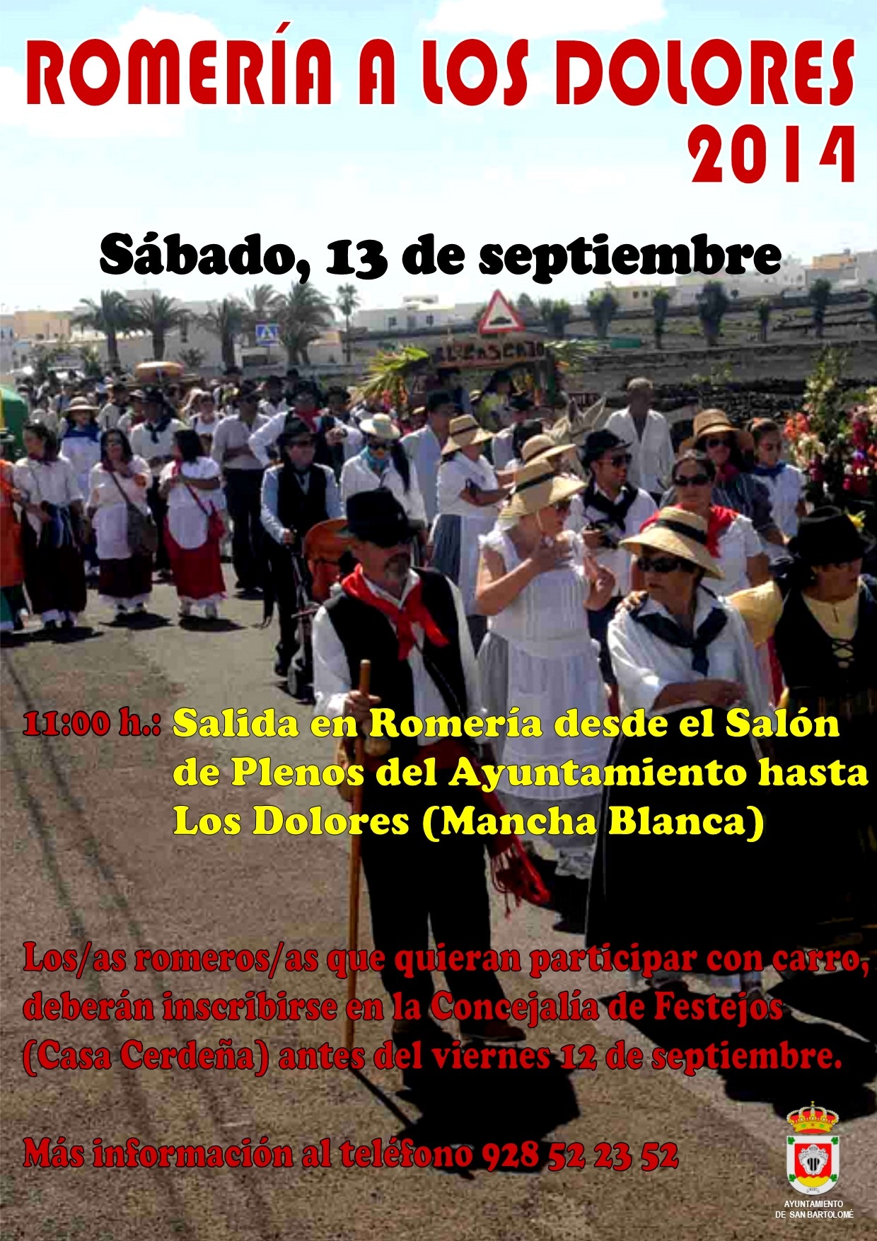 La concejalía de festejos del Ayuntamiento de San Bartolomé invita a todos los vecinos/as del municipio a participar en la Romería a Los Dolores, el sábado, día 13 de septiembre, con salida desde San Bartolomé (plaza del Ayuntamiento) a las 11.00 horas para llegar en romería a  Mancha Blanca y hacer la ofrenda municipal a la virgen de Los Dolores.