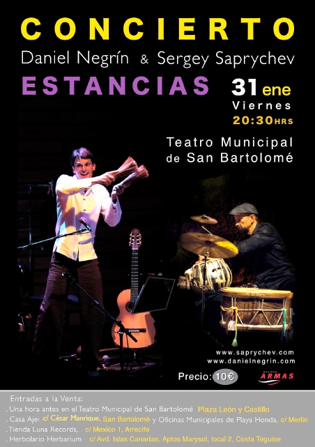El viernes, 31 de enero, a las 20:30 horas el Teatro Municipal de San Bartolomé, acogerá el Concierto “Estancias”, que será ofrecido por los músicos Daniel Negrín & Sergey Saprychev, ambos con una amplia trayectoria profesional a sus espaldas.