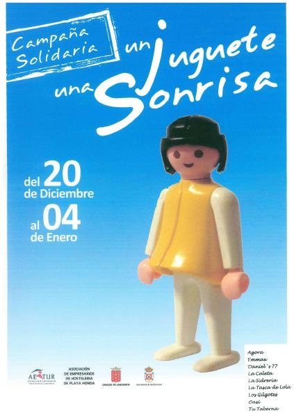 La Asociación de Empresarios de Hostelería de Playa Honda, integrada en AETUR, en colaboración con la Concejalía de Comercio del Ayuntamiento de San Bartolomé, y Cabildo de Lanzarote, inician el próximo 20 de diciembre la campaña solidaria “Un juguete, una sonrisa”, que concluirá el 4 de enero. Los ciudadanos que participen entregando su juguete, para que todos los niños cuenten con regalos, entrarán en un sorteo, que dependiendo el establecimiento puede ser un menú degustación, desayuno, cóctel para dos…etc.