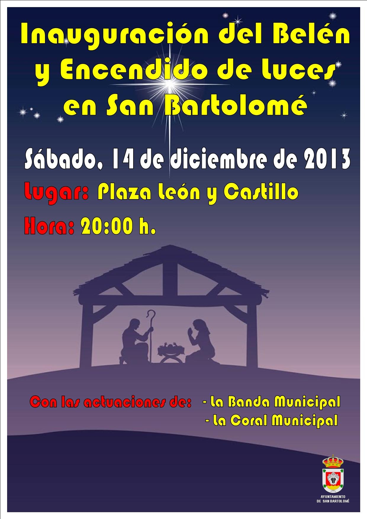 El sábado, día 14 de diciembre, a las 20.00 horas el Ayuntamiento de San Bartolomé inaugurará el Belén y se encenderán las luces navideñas, contando para la ocasión con las actuaciones de La Banda de San Bartolomé y Coral Municipal.