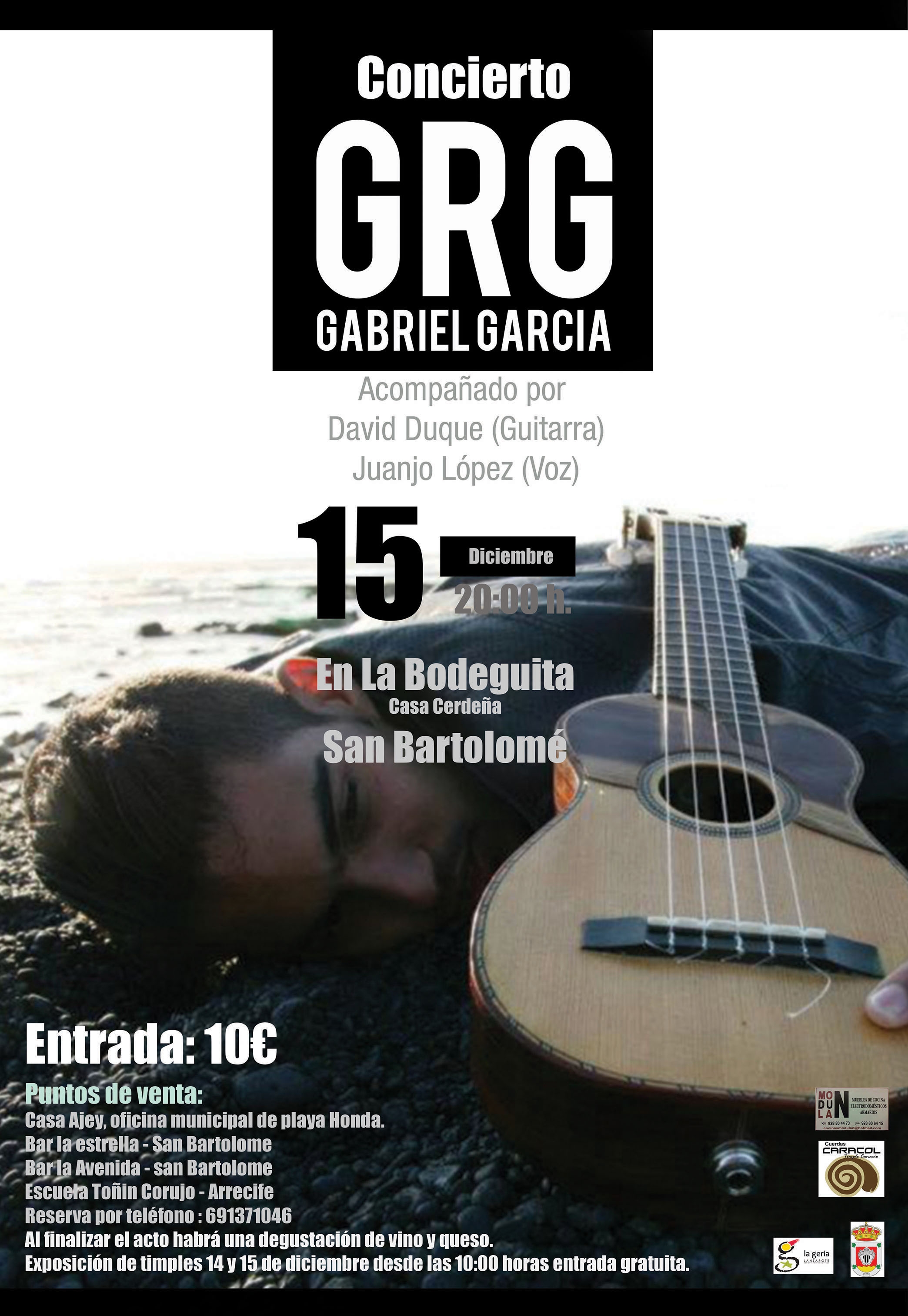 Gabriel García, con una simple puesta en escena, acompañado de Ivanhoe Rodríguez a la guitarra y Juanjo López a la voz, hizo un recorrido por sus composiciones y también por los tema más tradicionales como las folías o malagueñas. Entremezcló temas de composición propia con temas más tradicionales como folias, malagueñas o aires de Lima. Al finalizar el concierto los asistentes degustaron vinos y quesos a cargo de Bodegas La Geria. Colaboraron: Ayuntamiento de San Bartolomé, Cuerdas Caracol, Modulán y Bodegas La Geria. Como complemento del concierto, a lo largo del sábado 14 de diciembre, durante el desarrollo del Shopping San Bartolomé y durante el domingo 15 de diciembre, hasta dos horas antes del concierto, los visitantes pudieron ver los timples expuestos de la colección privada de Gabriel García, en la Bodeguita.