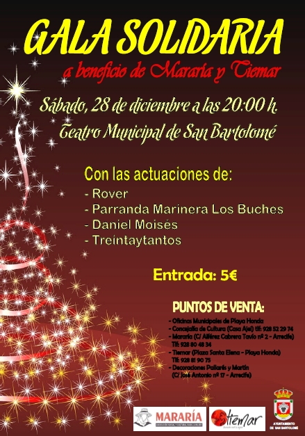 Las Asociaciones Mararía y Tiemar, con la colaboración del Ayuntamiento de San Bartolomé, han preparado una gala musical para la noche del día 28 de diciembre de 2013.