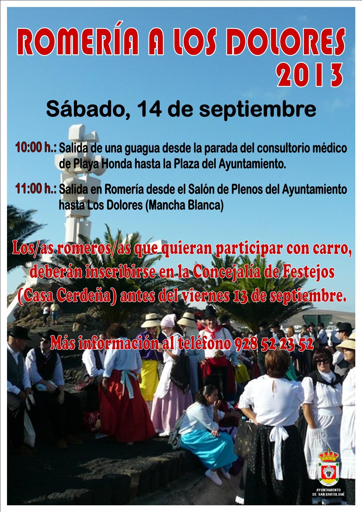 La concejalía de festejos del Ayuntamiento de San Bartolomé invita a todos los vecinos/as del municipio a participar en la Romería a Los Dolores, el sábado, día 14 de septiembre, con salida desde San Bartolomé (plaza del Ayuntamiento) a las 11.00 horas para llegar en romería a Mancha Blanca y hacer la ofrenda municipal a la virgen de Los Dolores.