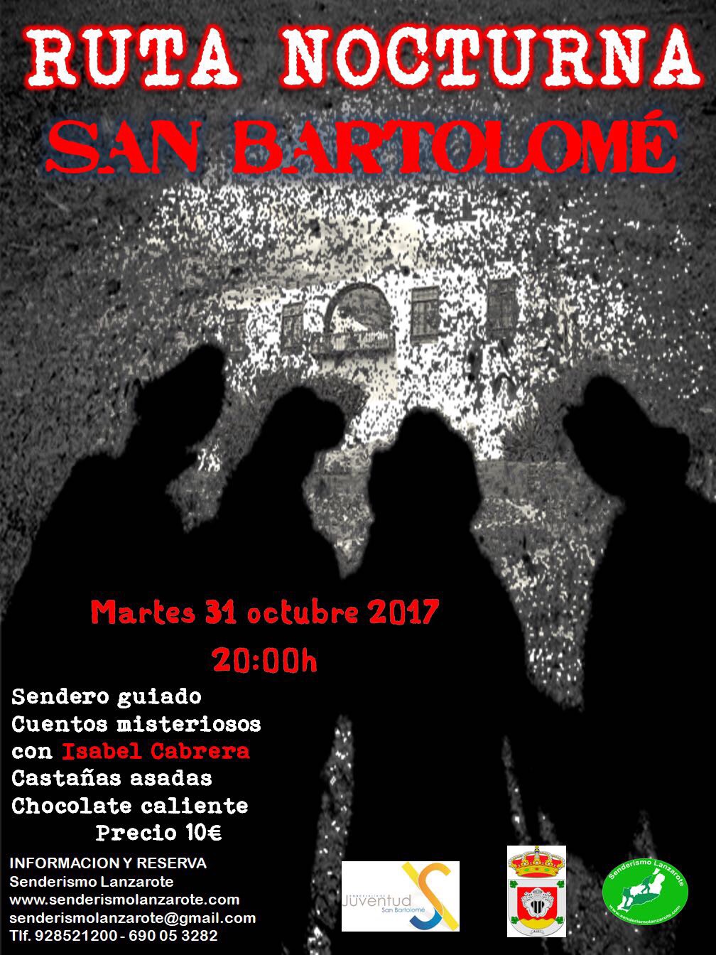 Coincidiendo con la noche previa a la celebración del día de todos los santos, se organiza una actividad desde la concejalía de juventud del Ayuntamiento de San Bartolomé, delegada en Isabel Sosa, que consistirá en ruta de senderismo por el casco de San Bartolomé, que incluye narración de cuentos misteriosos a cargo de Isabel Cabrera, para la noche del 31 de octubre, con salida a partir de las 20.00 horas desde la Casa Mayor Guerra.