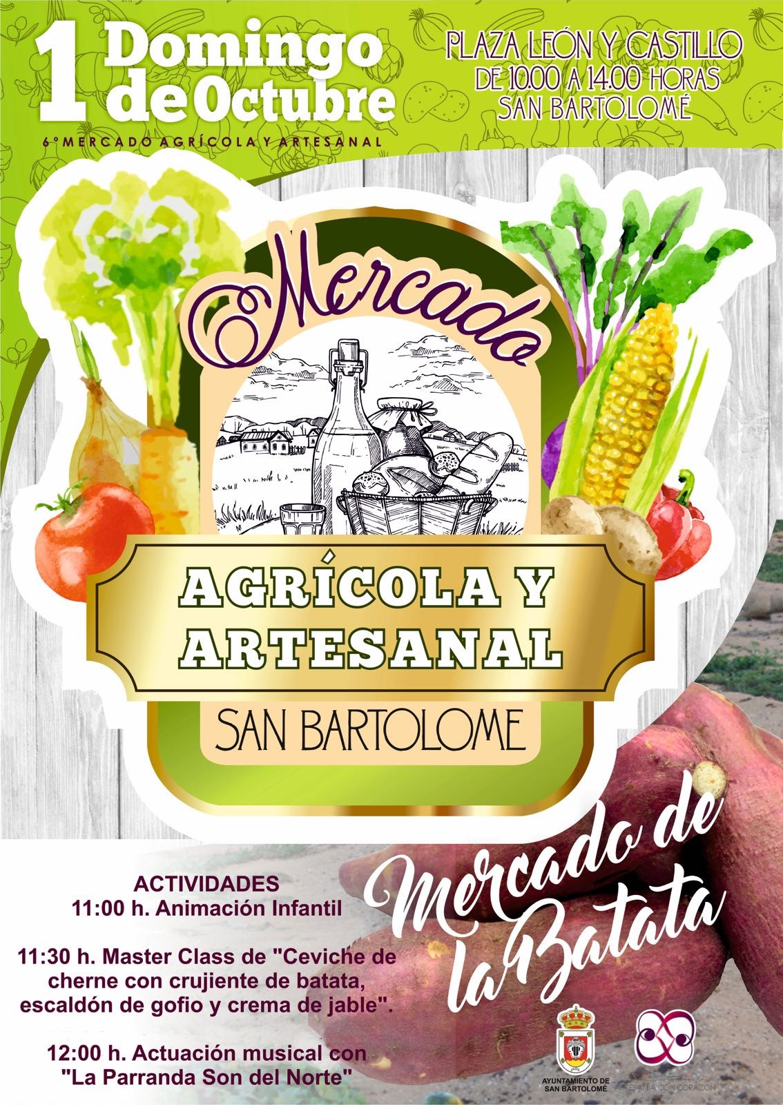 El Ayuntamiento de San Bartolomé informa a toda la ciudadanía que el domingo, día 1 de octubre, de 10.00 a 14.00 horas estará instalado el Mercado de productos agrarios, quesos y artesanía de San Bartolomé, que se desarrollará todos los primeros domingos del mes, en la Plaza León y Castillo (delante de la Sociedad El Porvenir).