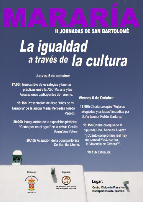 Estas jornadas son organizadas por la Asociación Social y Cultural para las mujeres MARARIA y tendrán lugar los próximos días 5 y 6 de Octubre, en el Centro Cívico de Playa Honda.