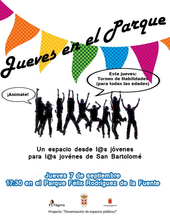 La Concejalía de Participación Ciudadana del Ayuntamiento de San Bartolomé, delegada en María Dolores Fernández, invita a los jóvenes, hoy jueves, día 7 de septiembre, de 17:30 a 19:00 horas, en el parque Félix Rodríguez de la Fuente, al “Torneo de Habilidades”.