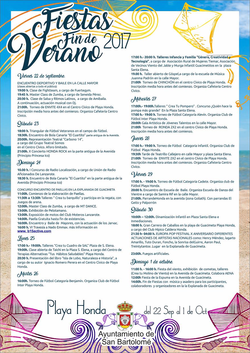 El Ayuntamiento de San Bartolomé informa que con motivo de las Fiestas Fin de Verano, Playa Honda 2017, desde hoy miércoles, día 20 de septiembre hasta el lunes, día 2 de octubre, permanecerá cerrada la Explanada de Guacimeta, por lo que el acceso al Campo de Fútbol de Playa Honda será por la prolongación de la calle Alisios a calle Mástil. Disculpen las molestias.