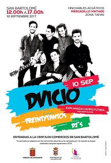 DVICIO en Concierto, Treintytantos, humor, hinchables para los más pequeños de la casa, zona de tapas y mercadillo, son los platos fuertes de la jornada festiva, con la concluye el verano y la campaña de dinamización del comercio local en temporada de rebajas. La Explanada del Campo de Fútbol de San Bartolomé, 10 de septiembre de 12.00 a 17.00 horas será el lugar que acogerá todas las actividades previstas.