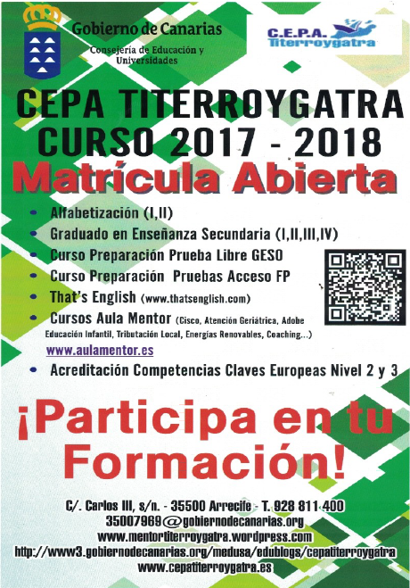 El Centro de Educación de Personas Adultas de Lanzarote, CEPA Titerroygatra, comunica que permanece abierta la matrícula para el curso 2017-2018 para las enseñanzas de: