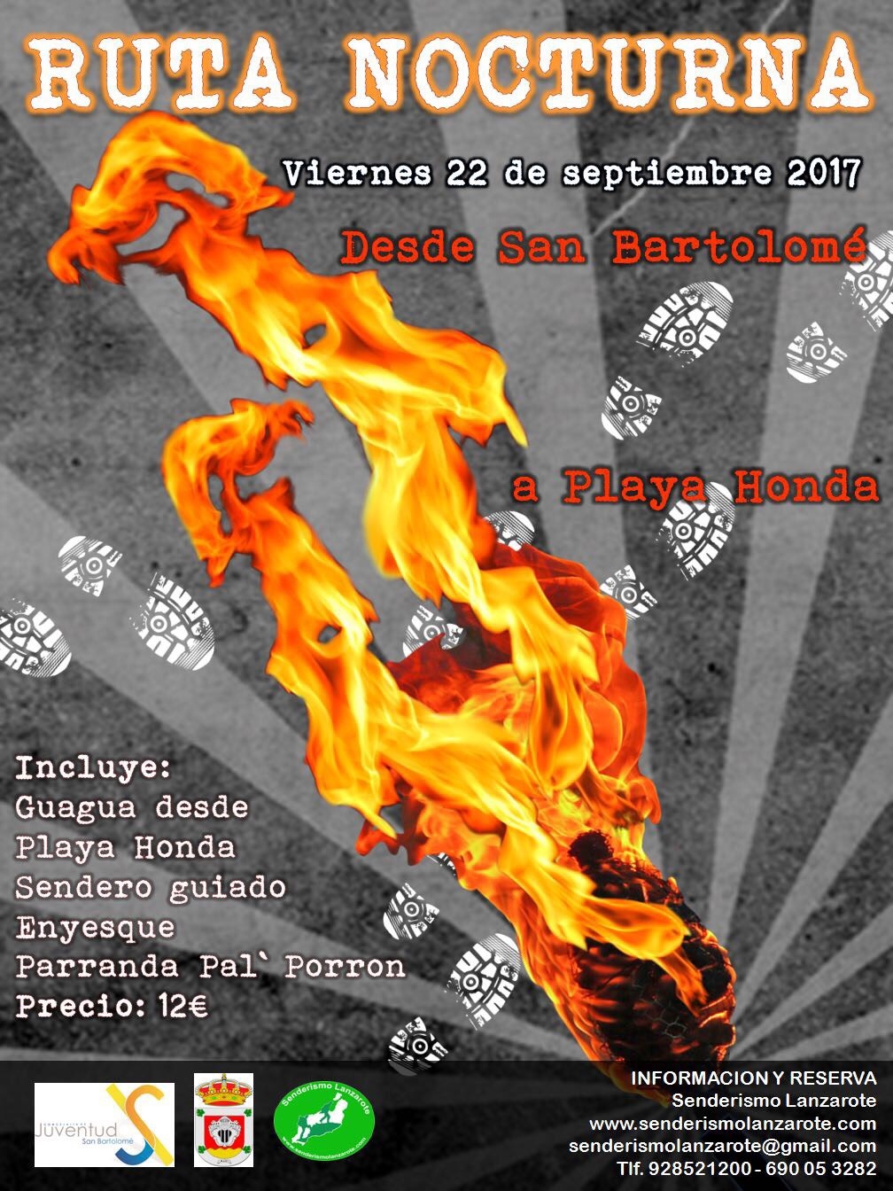 El primer senderismo trata de una ruta nocturna desde San Bartolomé a Playa Honda por la zona del Jable. Al finalizar tendrá lugar un enyesque acompañados por la parranda Pal Porrón. Incluye guagua. Es necesaria inscripción previa. Precio: 12 euros.