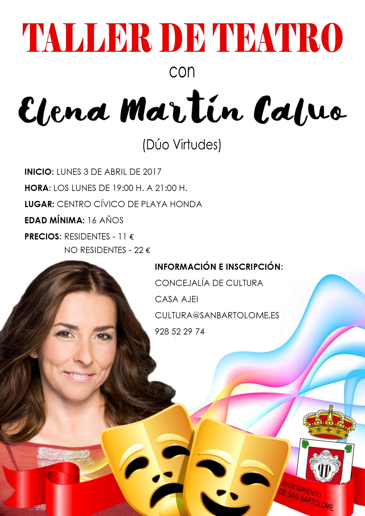 .Elena Martín Calvo, del famoso Dúo Virtudes, impartirá un taller organizado por la concejalía de cultura del Ayuntamiento de San Bartolomé, de teatro, que dará comienzo el lunes 3 de abril, en el Centro Cívico de Playa Honda, y se desarrollará los lunes de 19.00 a 21.00 horas, pudiendo participar aquellas personas interesadas, mayores de 16 años que les guste el teatro o que quieran vencer el miedo escénico.