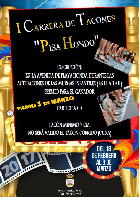 Al finalizar las actuaciones GRAN CARRERA DE TACONES  “Pisa Hondo”, para participar en la carrera imprescindible venir disfrazado. Inscripción durante las actuaciones de las murgas infantiles.