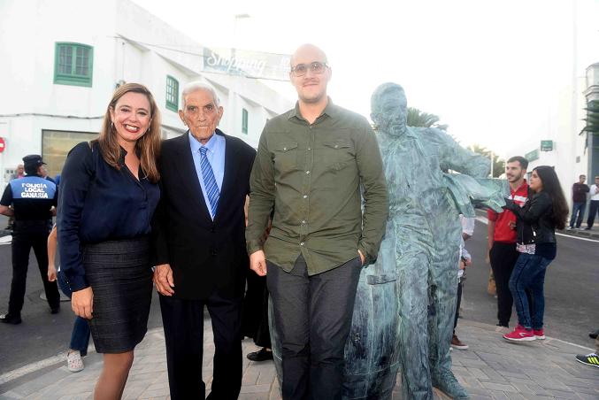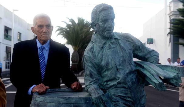 La alcaldesa de San Bartolomé, María Dolores Corujo Berriel, descubrió en la tarde de hoy acompañada por el escultor Rigoberto Camacho, la escultura “El Tonelero” y ante la mirada expectante de Felipe de León Rocío, con su amable rostro habitual pero muy emocionado, acompañado por su hermana y familiares más cercanos.