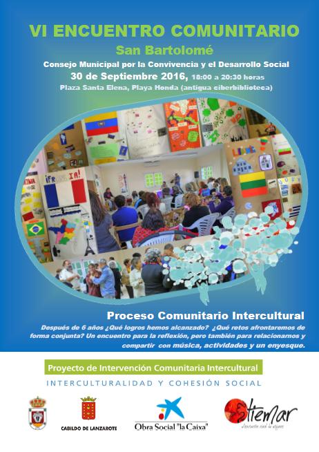 El próximo día 30 de septiembre de 18:00 a 20:30 horas (Plaza Sta. Elena de Playa Honda) VI ENCUENTRO COMUNITARIO que se desarrollará en el marco del Proceso de Intervención Comunitaria del municipio de San Bartolomé.