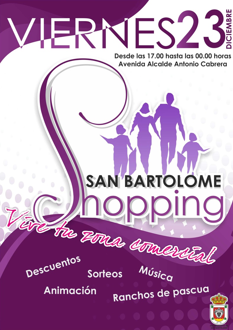 El lunes día 19 de diciembre, a las 10.00 horas, la Avenida Antonio Cabrera Barrera (rotonda escultura) en San Bartolomé, se presentará a los medios de comunicación la I Jornada “San Bartolomé Shopping” que se desarrollará el viernes 23 de diciembre, desde las 17.00 a las 24.00 horas, y consistirá en una jornada de puertas abiertas de los locales comerciales de la avenida de San Bartolomé para potenciar y dinamizar las ventas navideñas en los comercios de la zona. La jornada contará con una amplia programación paralela.Estarán presentes, la Alcaldesa, María Dolores Corujo, la primera teniente alcaldesa, Carmen González y el concejal de AEDL, Turismo y Juventud, David Rocío, que detallarán la programación.
