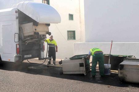 El Ayuntamiento de San Bartolomé, a través de la Concejalía de Obras y Servicios Públicos y Medio Ambiente, ante la creciente demanda vecinal y teniendo en cuenta el estado de suciedad y mal olor que desprenden los contenedores de recogida de residuos sólidos urbanos instalados en las vías públicas, está procediendo a la limpieza de contenedores de residuos domiciliarios, en todo el municipio. Para conseguir un resultado final óptimo se requiere de una limpieza intensiva y urgente que incluye lavado interior-exterior con aplicación de detergentes y agua caliente a presión así como cepillado. Los operarios han comenzado la limpieza de los contenedores en la calle Chimidas de Playa Honda.