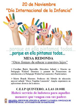 El Ayuntamiento de San Bartolomé, a través del Servicio de Atención al Menor y La Familia, de la Concejalía de Bienestar Social, delegada en Carmen González, invita a toda la ciudadanía a participar en la mesa redonda que se celebrará para conmemorar el Día Internacional de la Infancia, bajo el lema ”porque en ella pintamos todos…”.