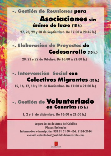 Los cursos se desarrollarán, con plazas limitadas, en horario de tarde, en el Salón de Actos del Cabildo de Lanzarote y contarán con una duración de entre 15 y 20 horas lectivas cada uno.