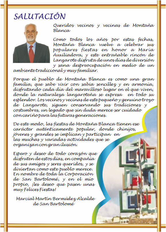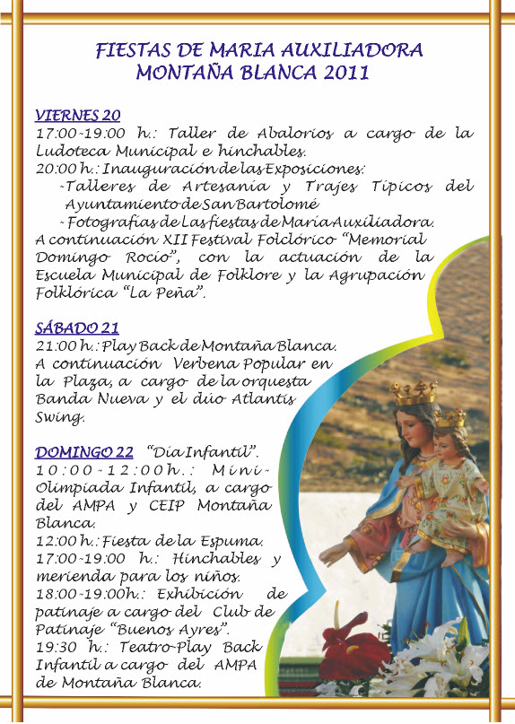 El calendario de las festividades municipales, que se extenderán hasta finalizar el verano, en cada uno de los pueblos del municipio, dará comienzo el viernes día 20 de mayo en la localidad de Montaña Blanca, con las Fiestas en honor a María Auxiliadora.